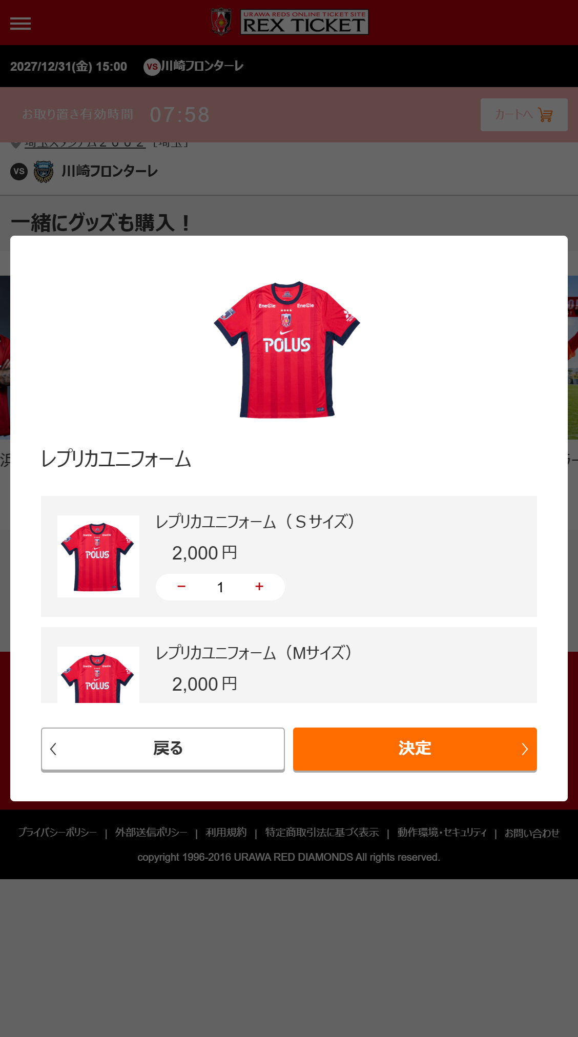 ご希望のグッズの個数、サイズ(一部グッズのみ)を選択し「決定」をクリックします。